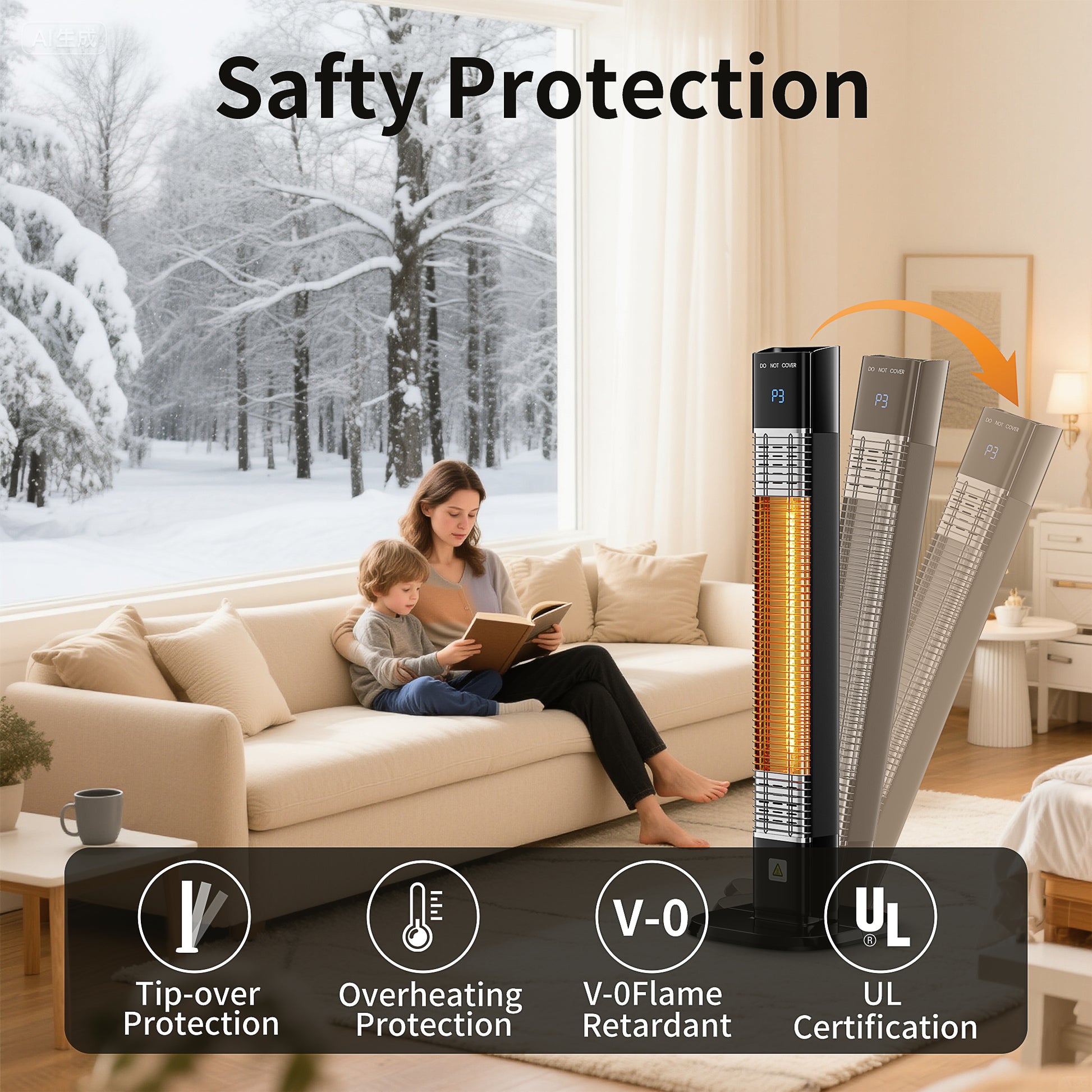 Multiple Safety Protections: Safety is a top priority. The heater features multiple protection mechanisms: Tip-over Protection automatically shuts off the device if it tilts or falls; Overheating Protection cuts off power when the temperature exceeds the safe range; V-0 Flame Retardant material prevents fire risks; and it has obtained UL Certification, ensuring reliable and safe operation for you and your family.